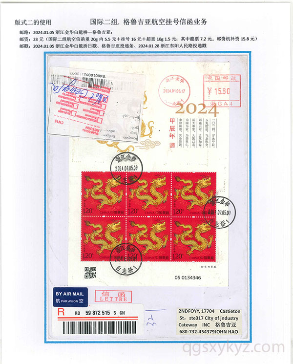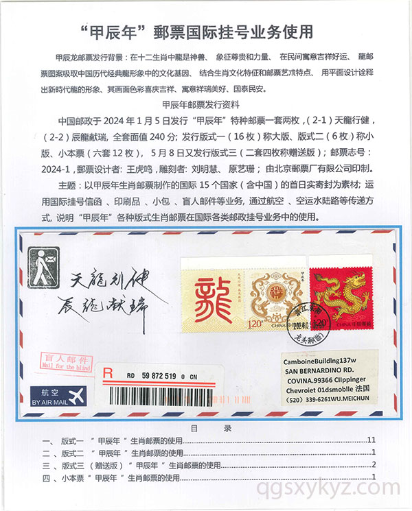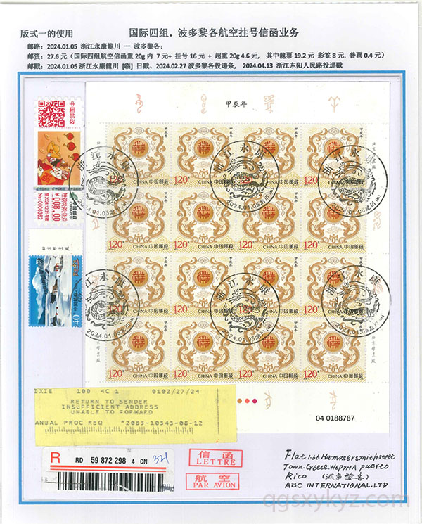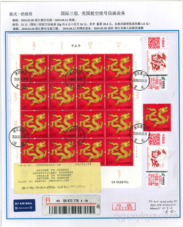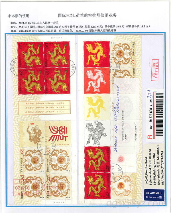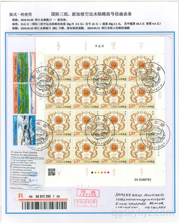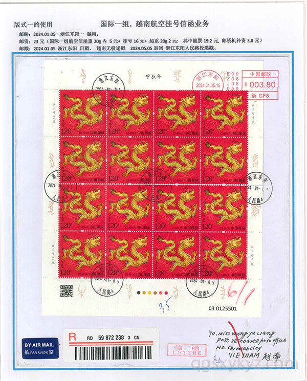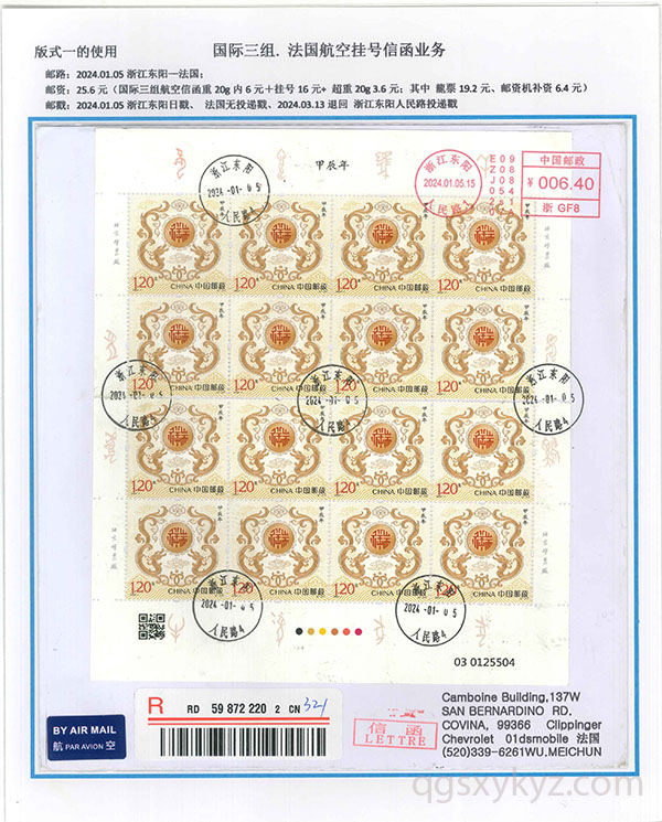 “甲辰年”邮票国际挂号业务使用