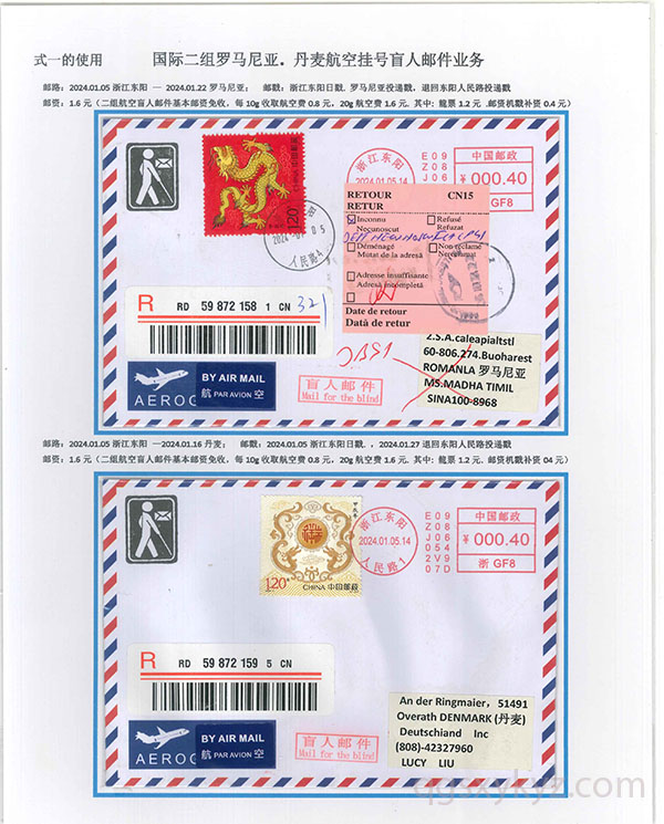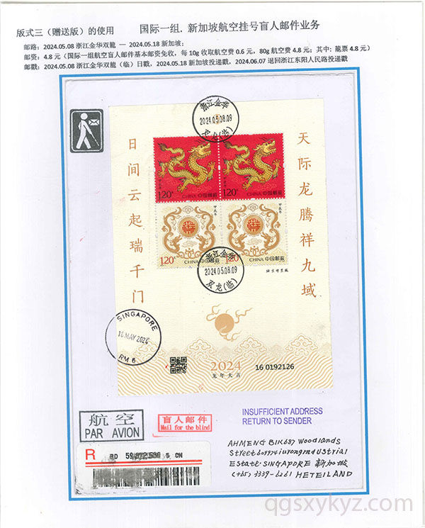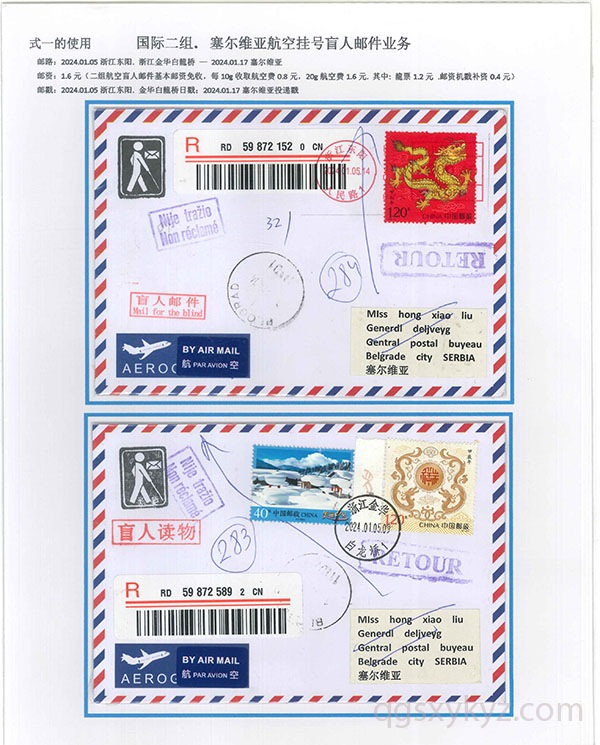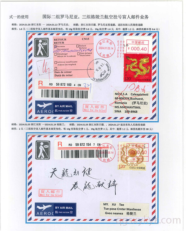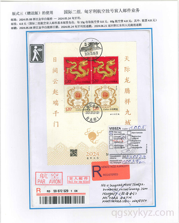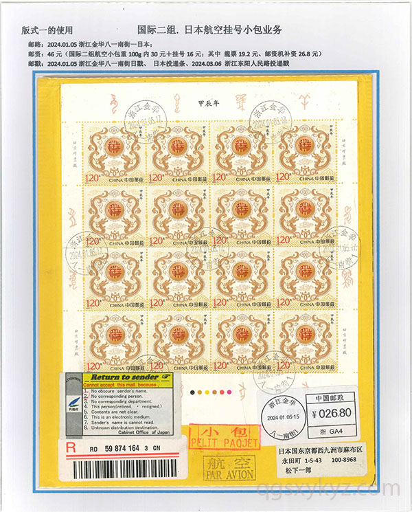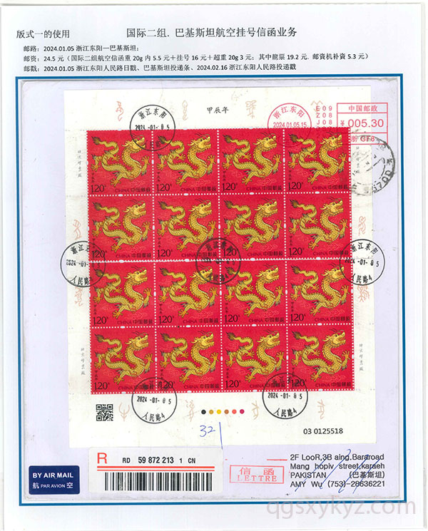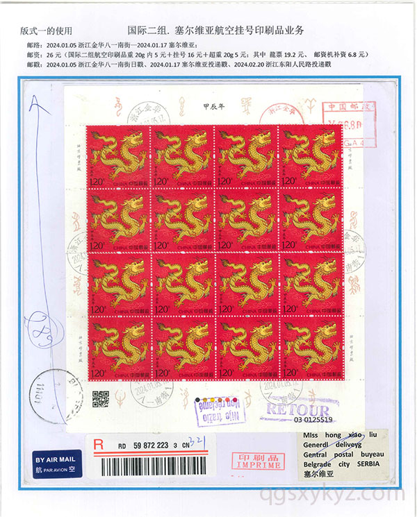 “甲辰年”邮票国际挂号业务使用