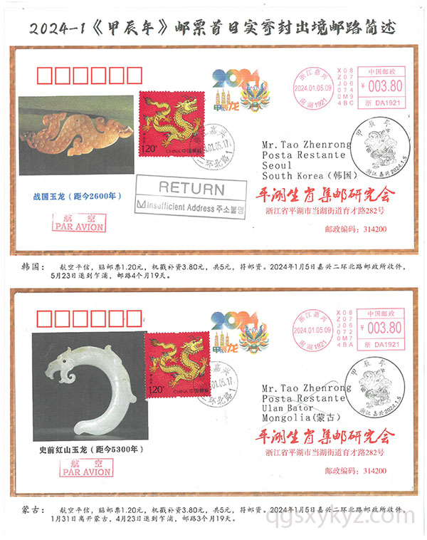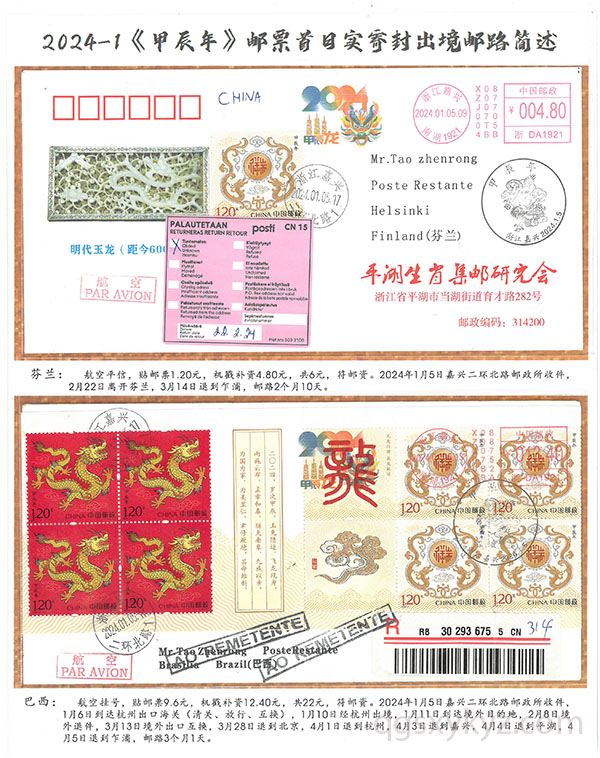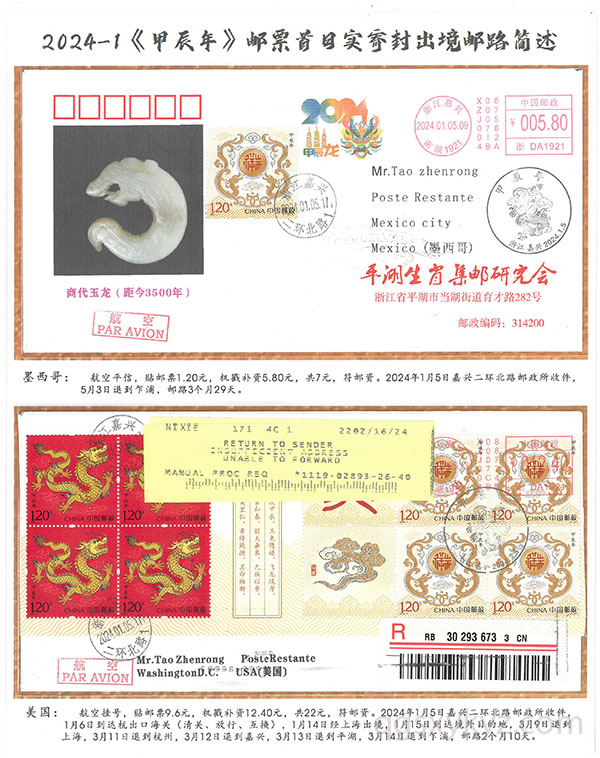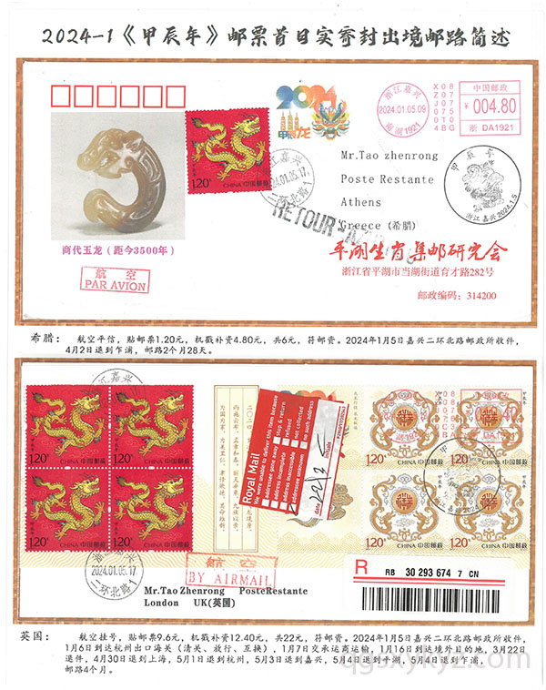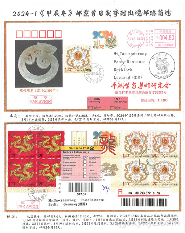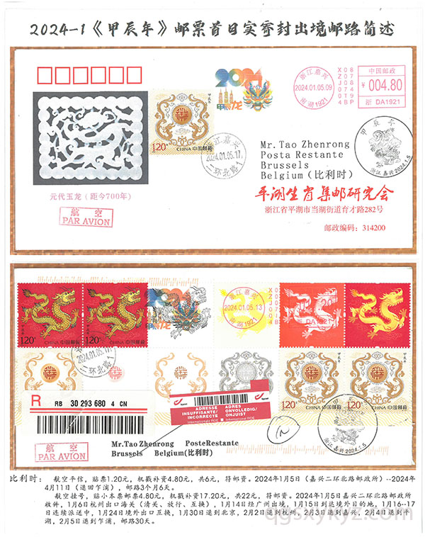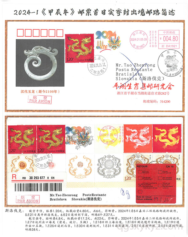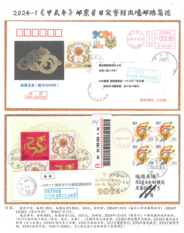 2024-1《甲辰年》邮票首日实寄封出境邮路简述