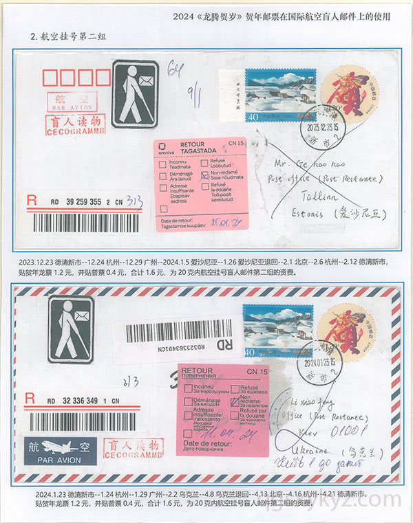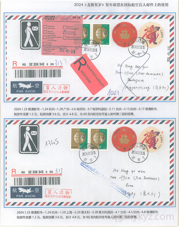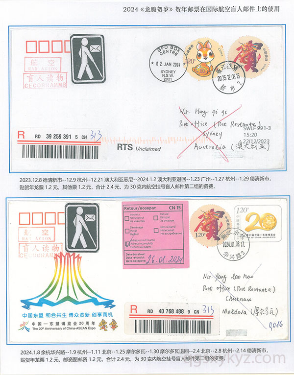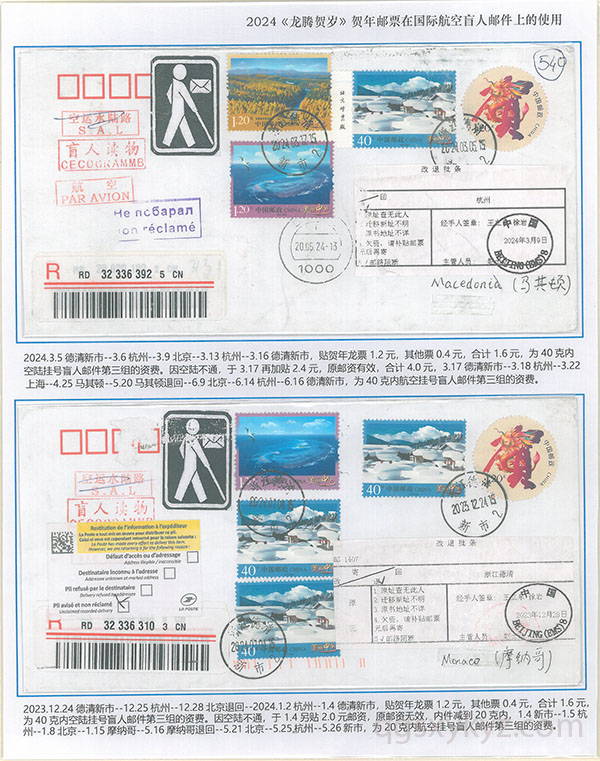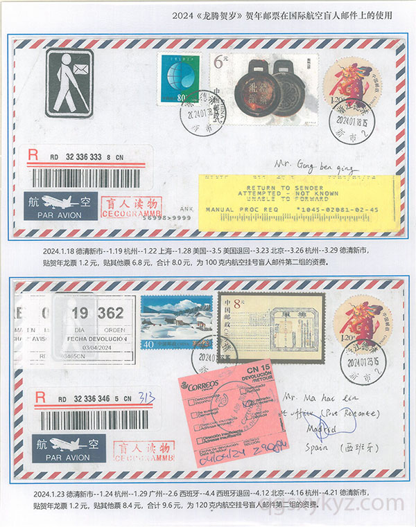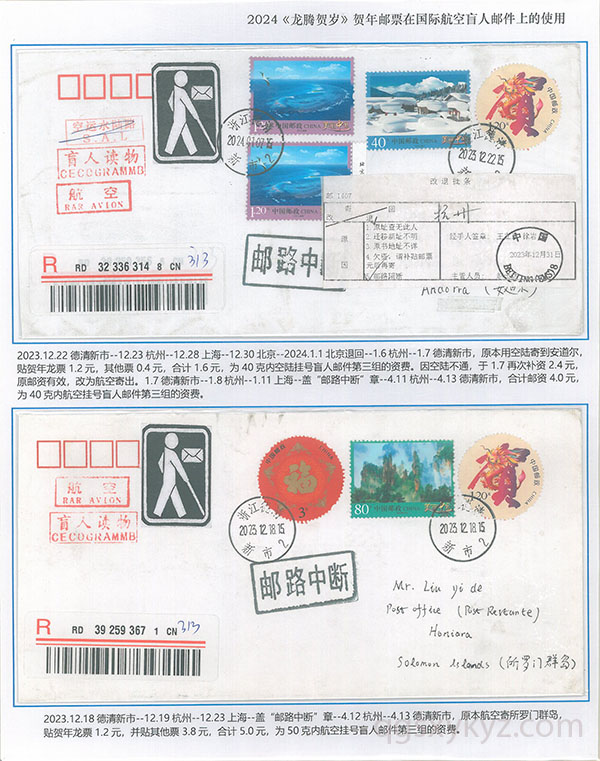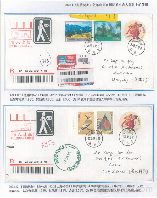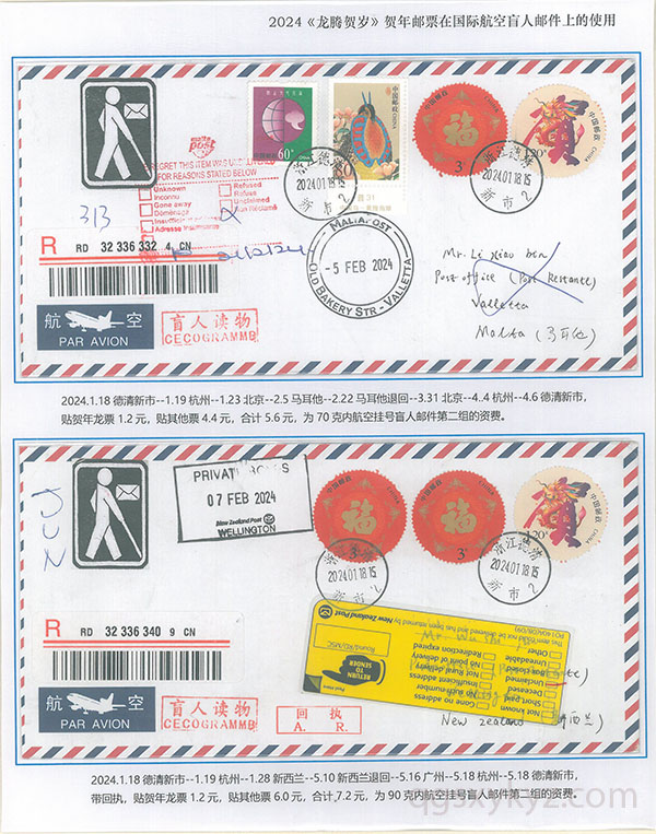 2024《龙腾贺岁》贺年邮票在国际航空盲人邮件上的使用