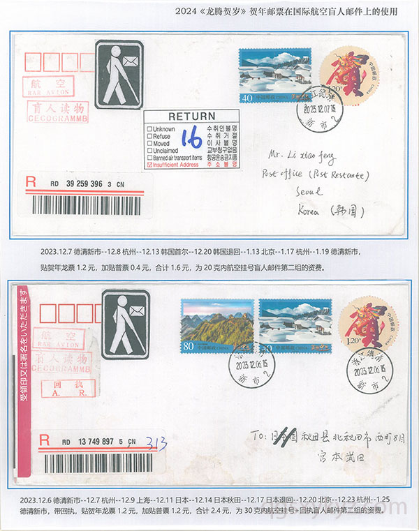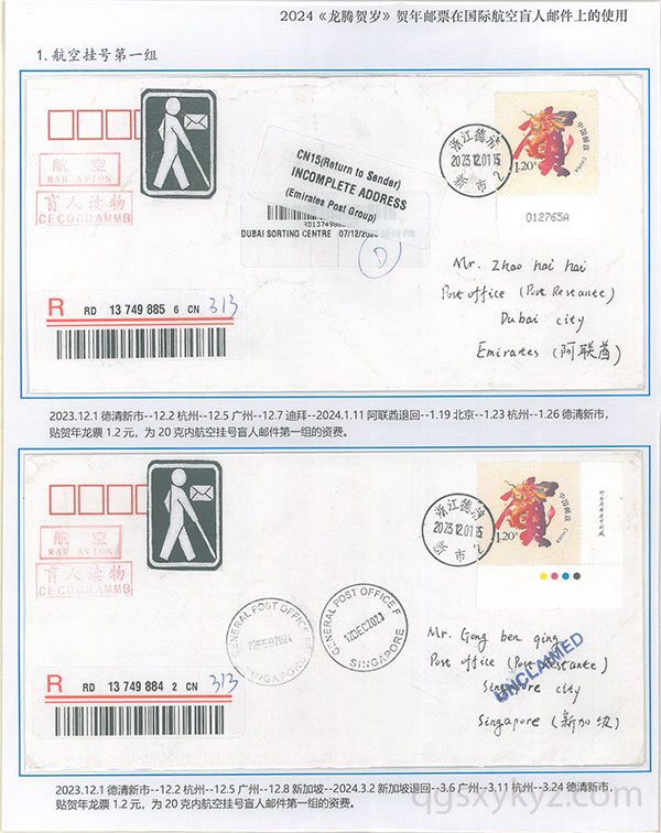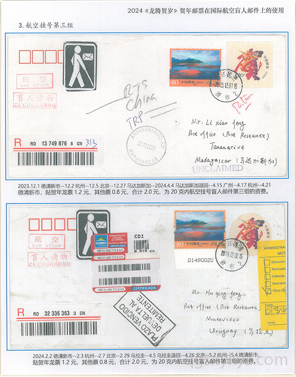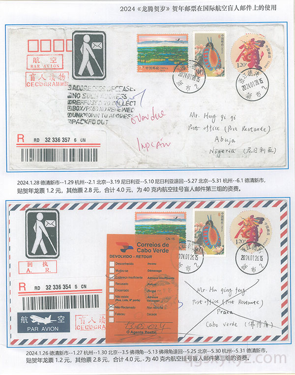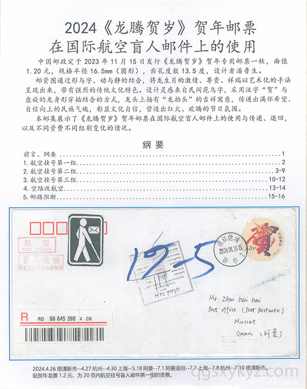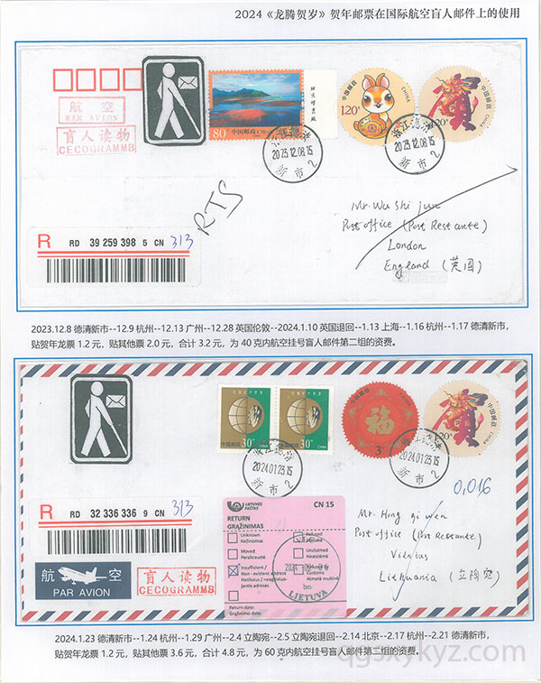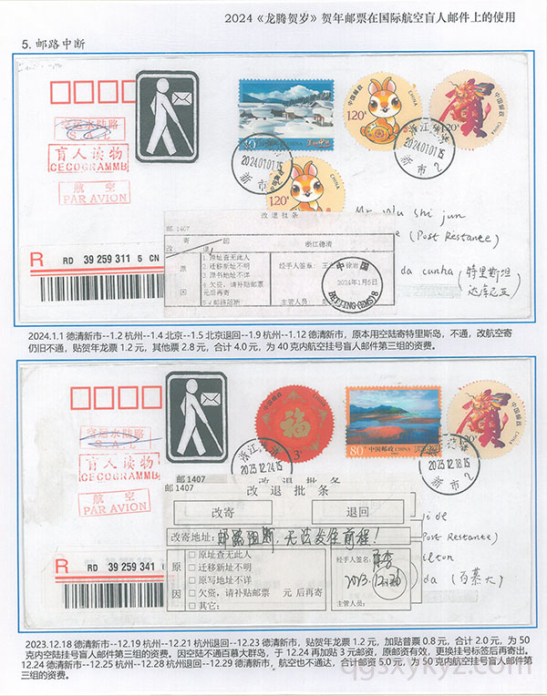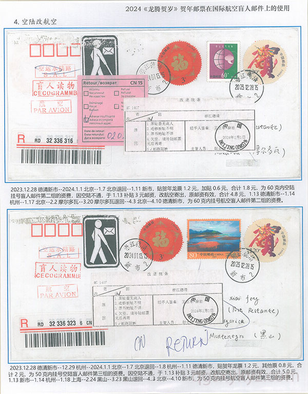 2024《龙腾贺岁》贺年邮票在国际航空盲人邮件上的使用