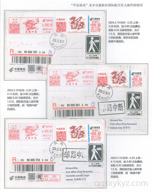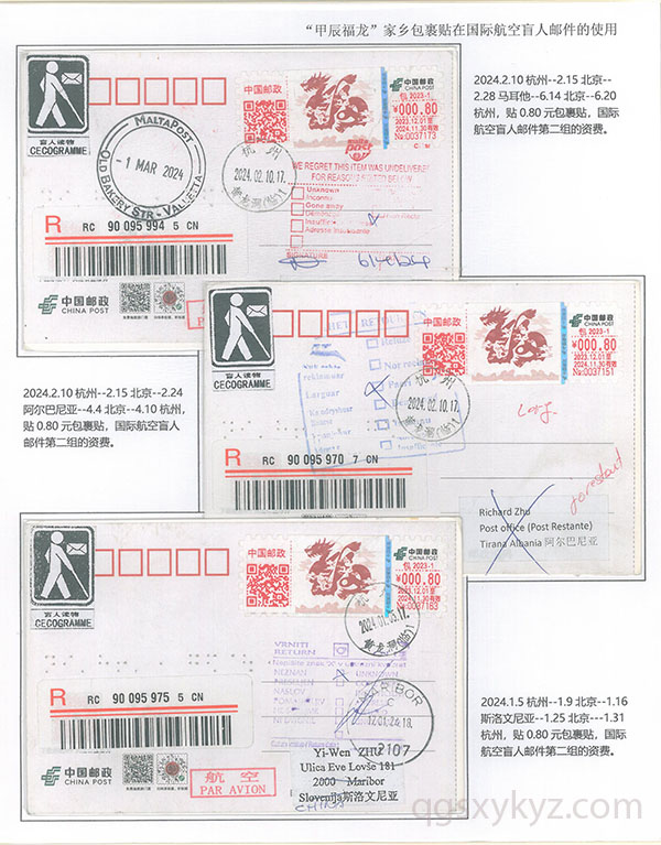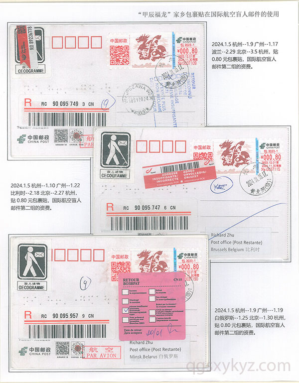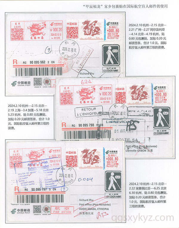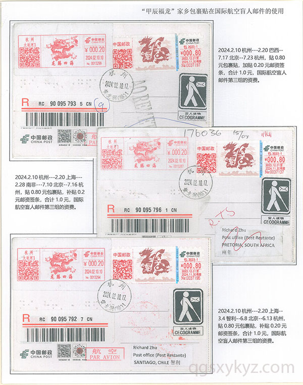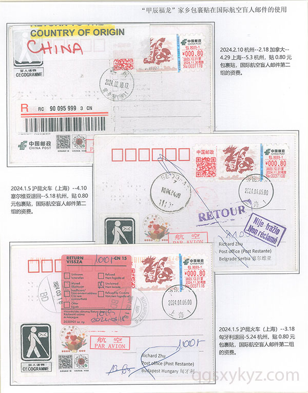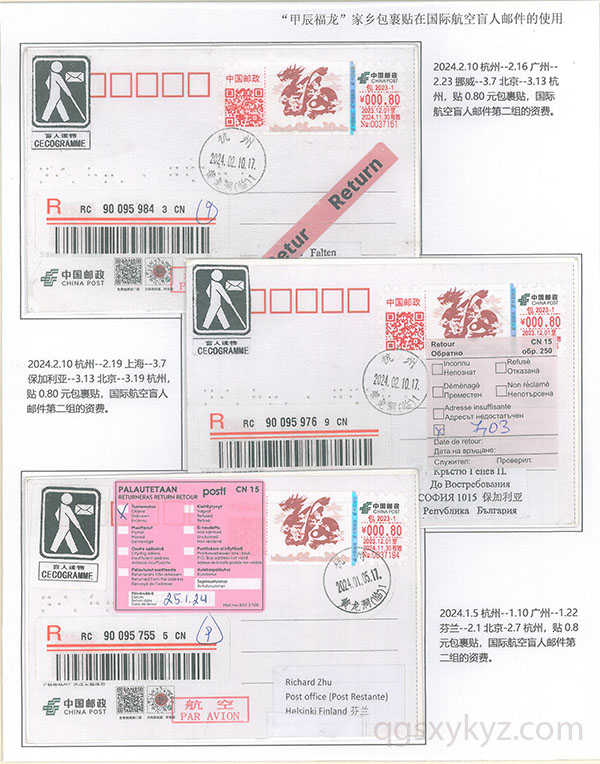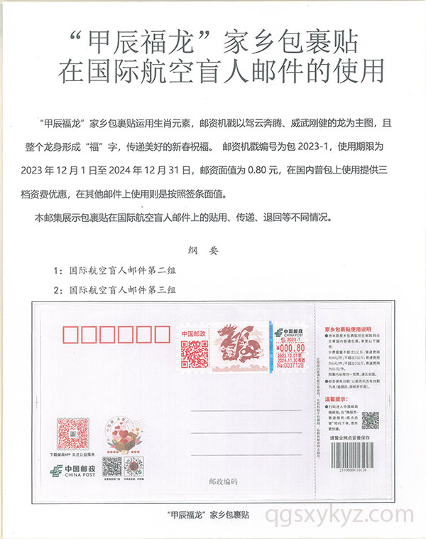 “甲辰福龙”家乡包裹贴在国际航空盲人邮件的使用