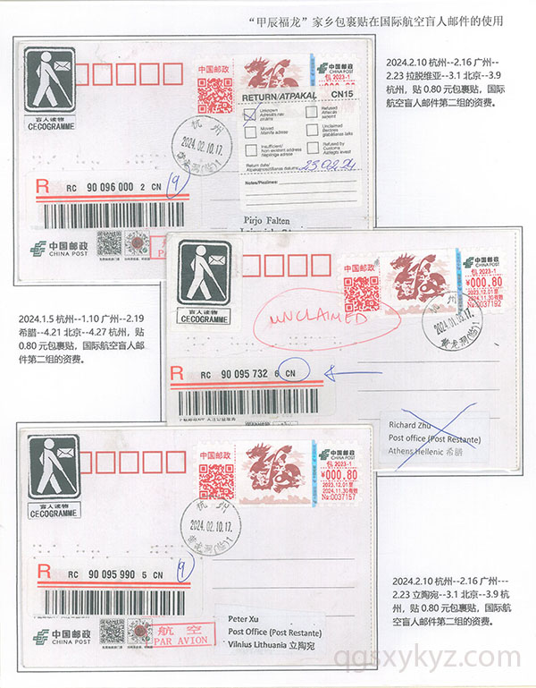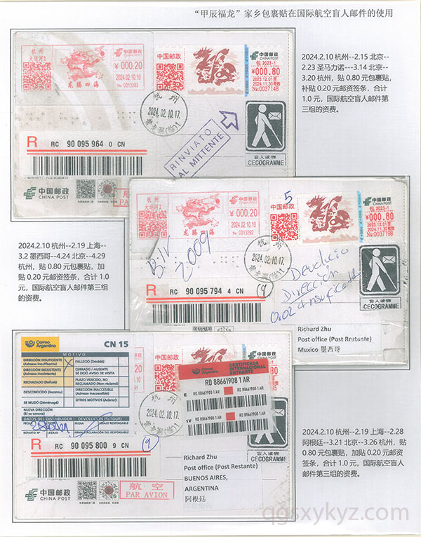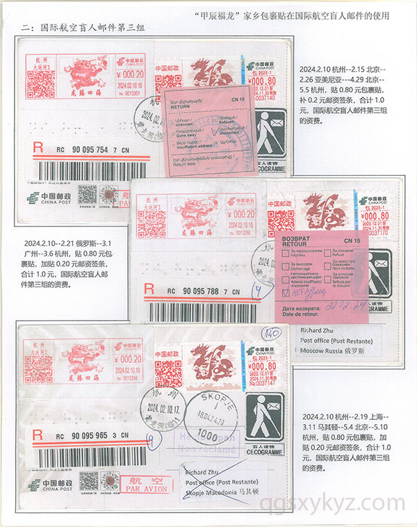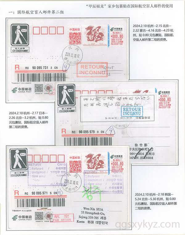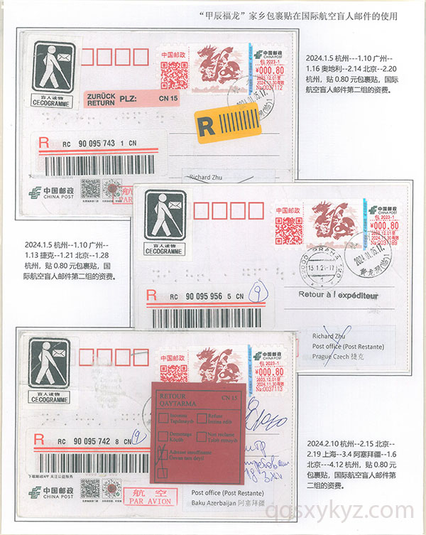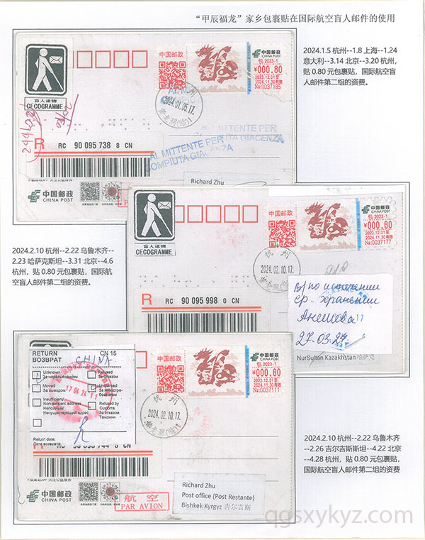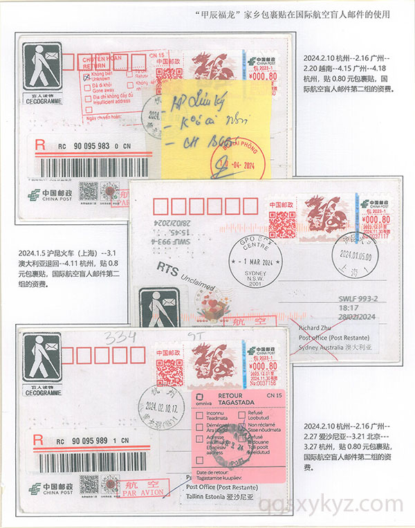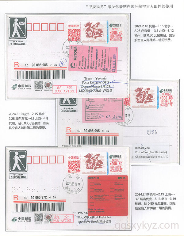“甲辰福龙”家乡包裹贴在国际航空盲人邮件的使用