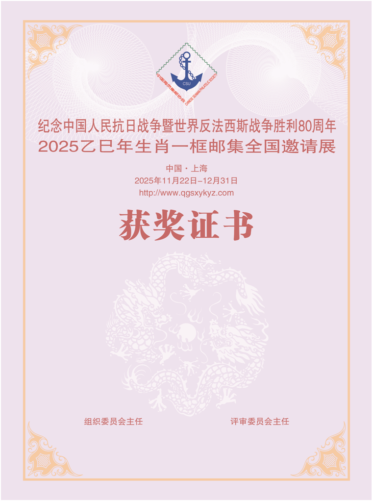 为了丰富人民群众文化生活,促进集邮文化的普及和发展,纪念中国人民抗日战争暨世界反法西斯战争胜利80周年暨2025乙巳年生肖一框邮集全国邀请展于2025年11月22日至12月31日在网络www.qgsxykyz.com隆重举行。展览由中国海员集邮协会主办,中国远洋海运集团邮协、上海邮政史集邮研究会承办,中远海运发展工会、上海化工集邮协会、东方封片戳研究会、上海交运集邮协会、上海浦东生肖集邮研究会协办,生肖集邮研究会支持。