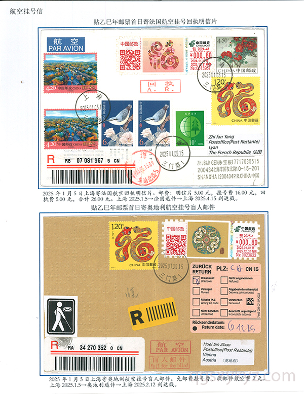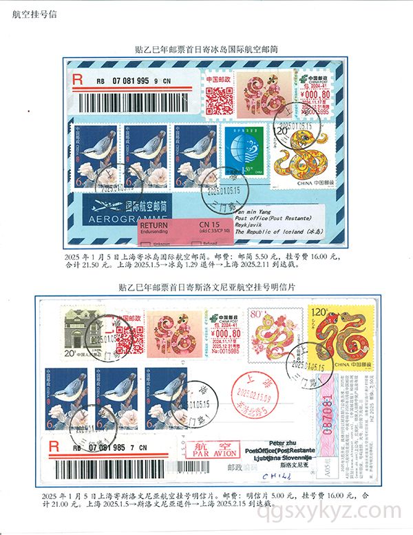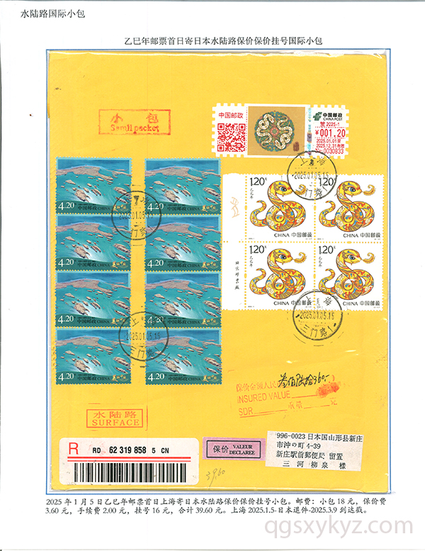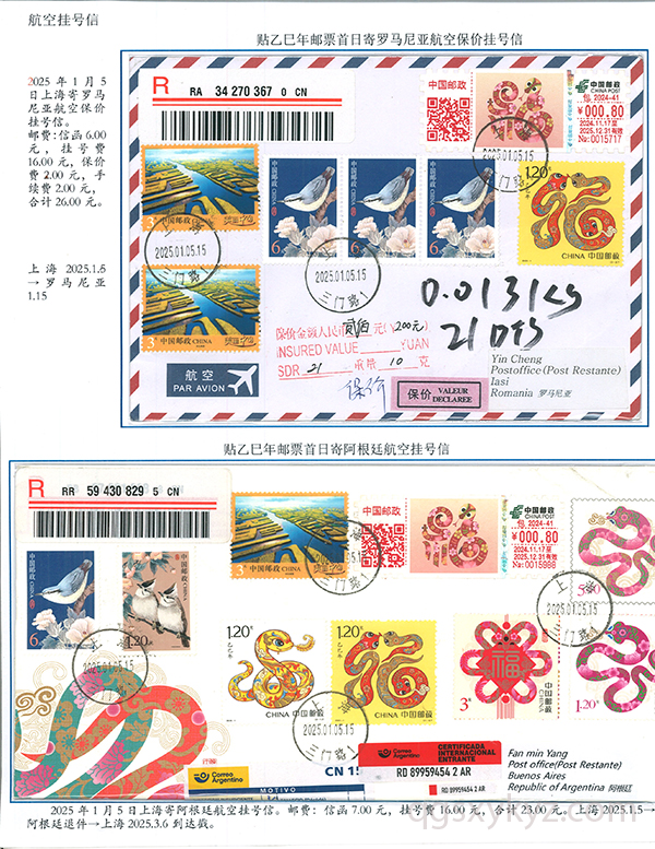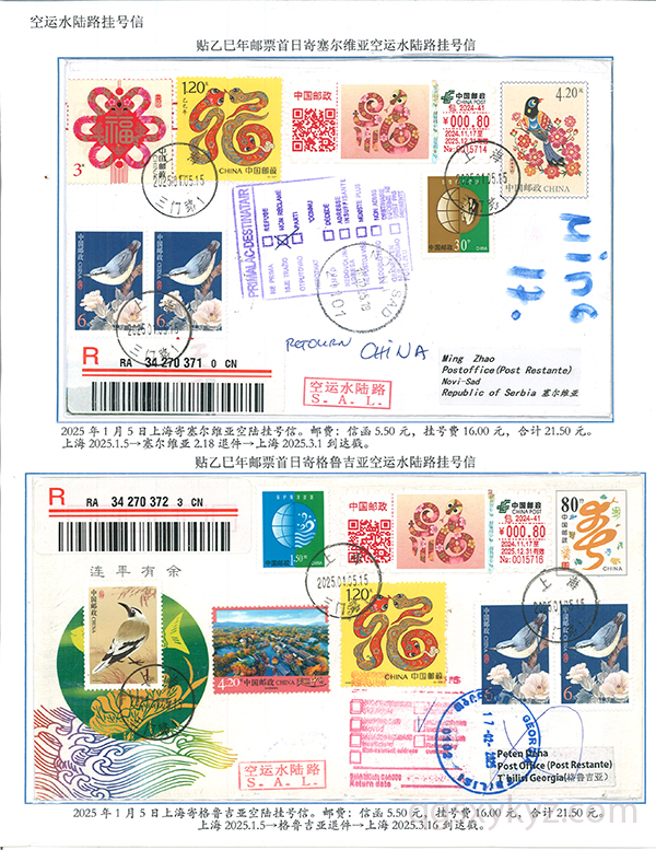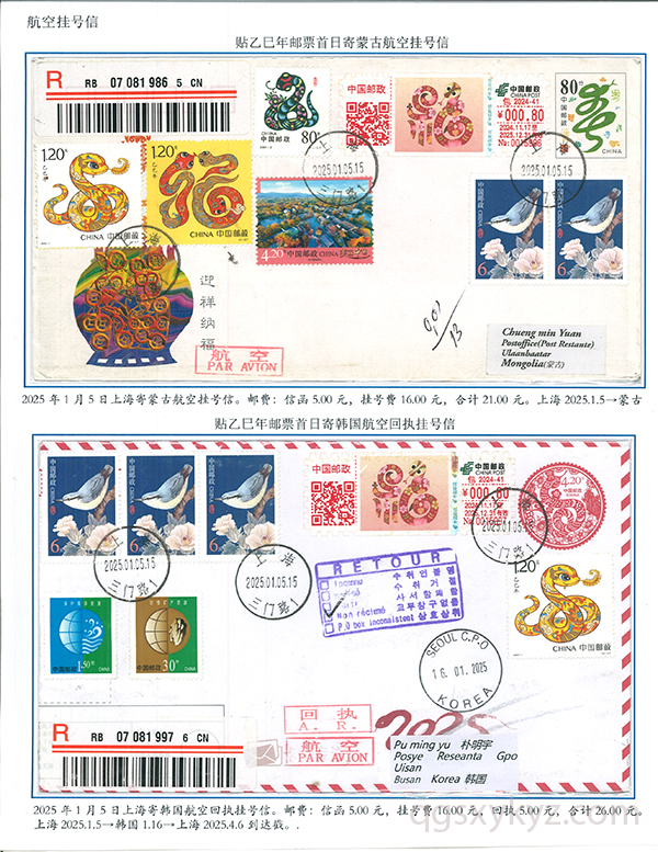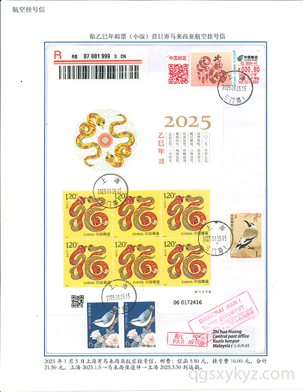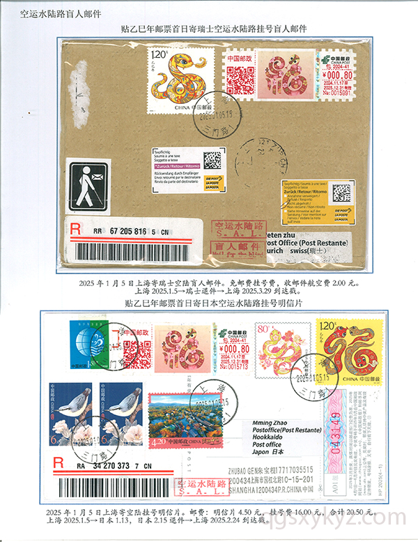 乙巳年邮票首日使用的国际挂号邮件