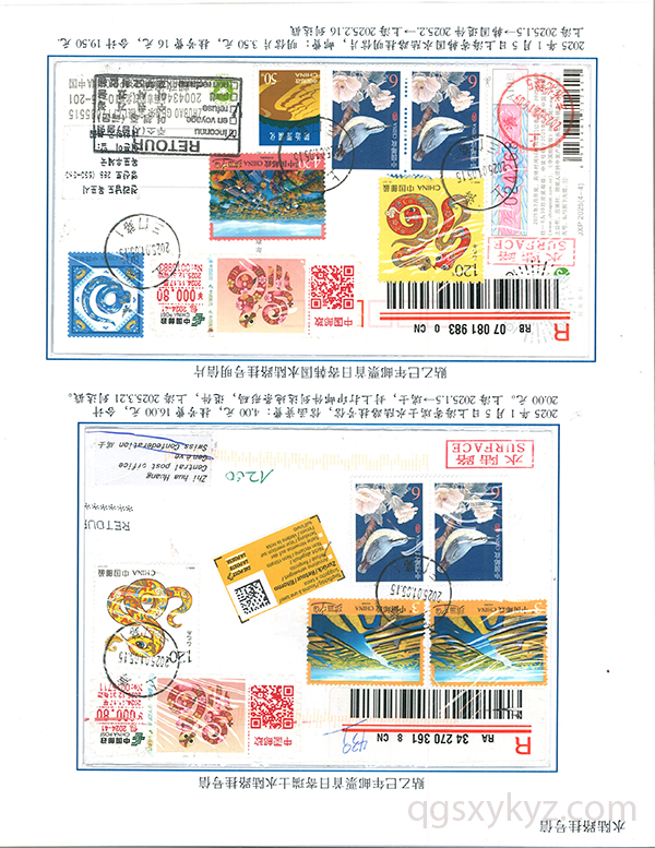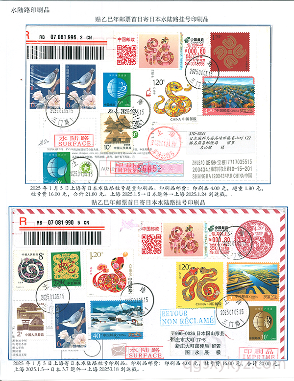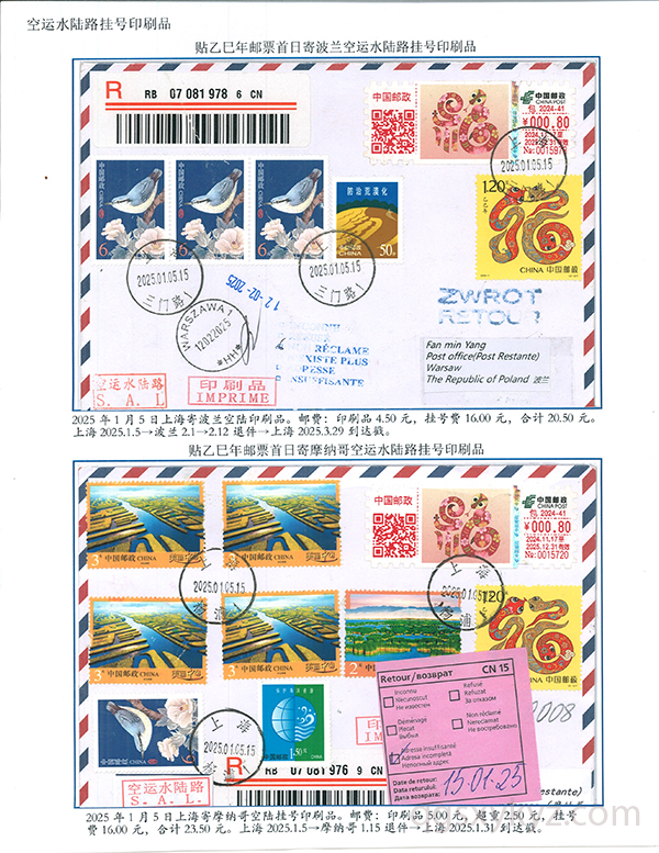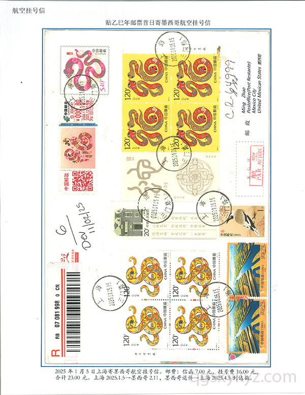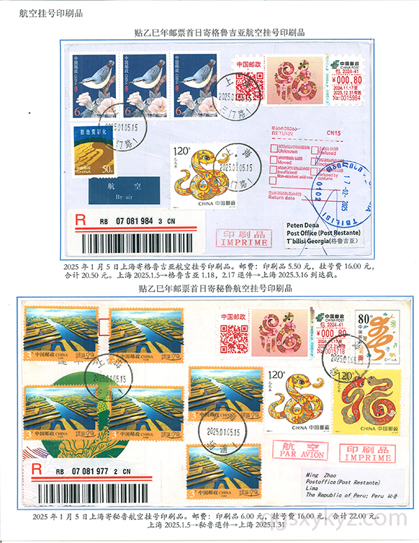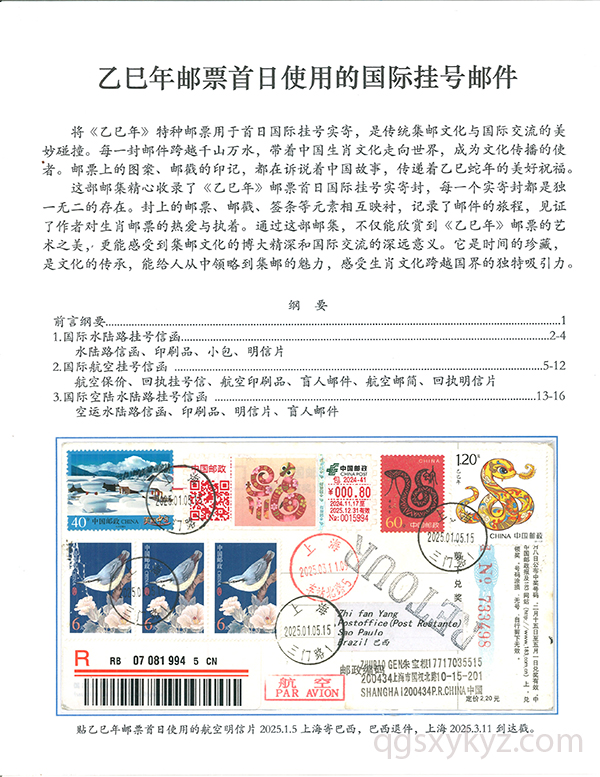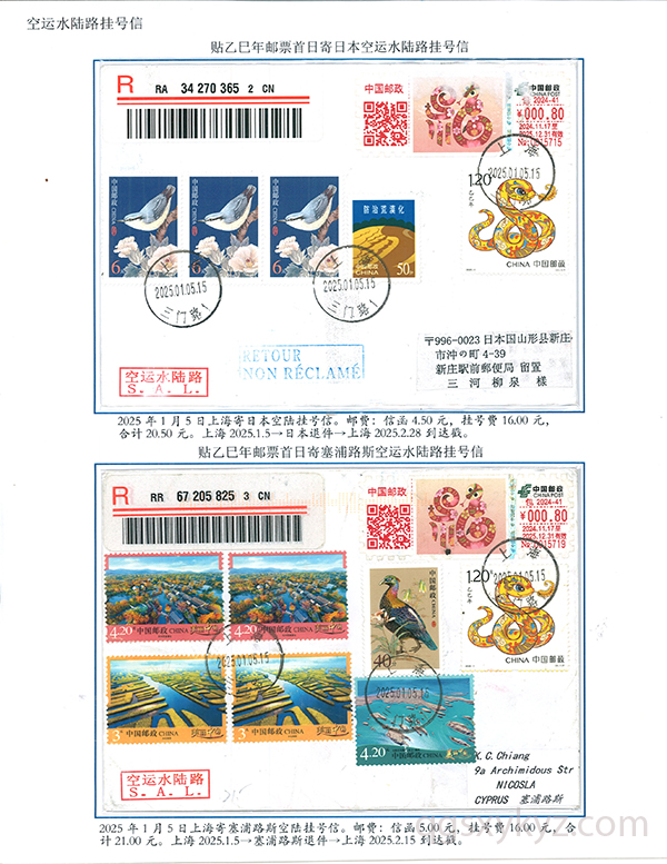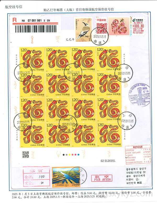 乙巳年邮票首日使用的国际挂号邮件
