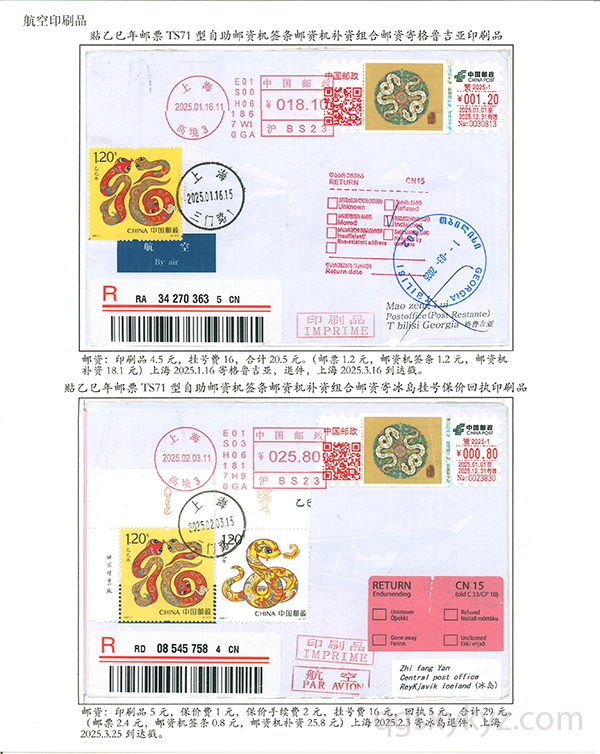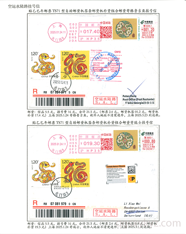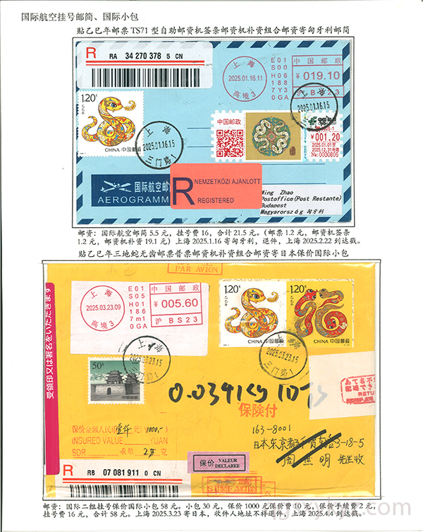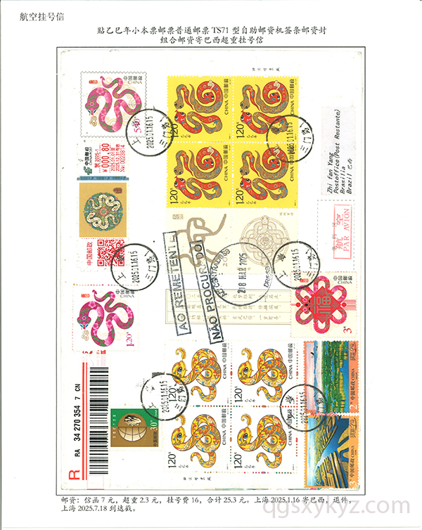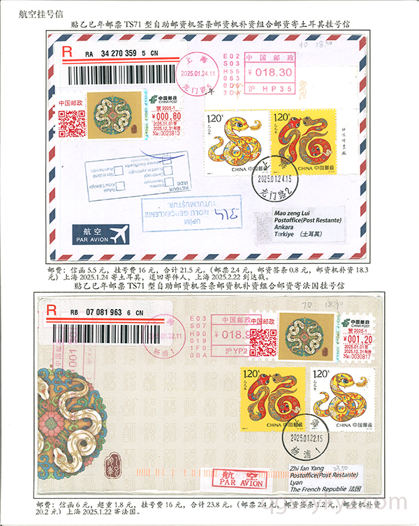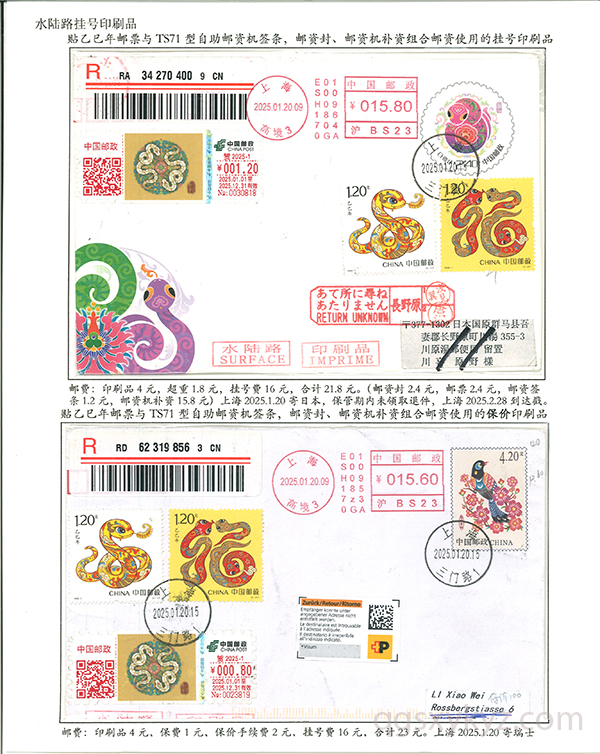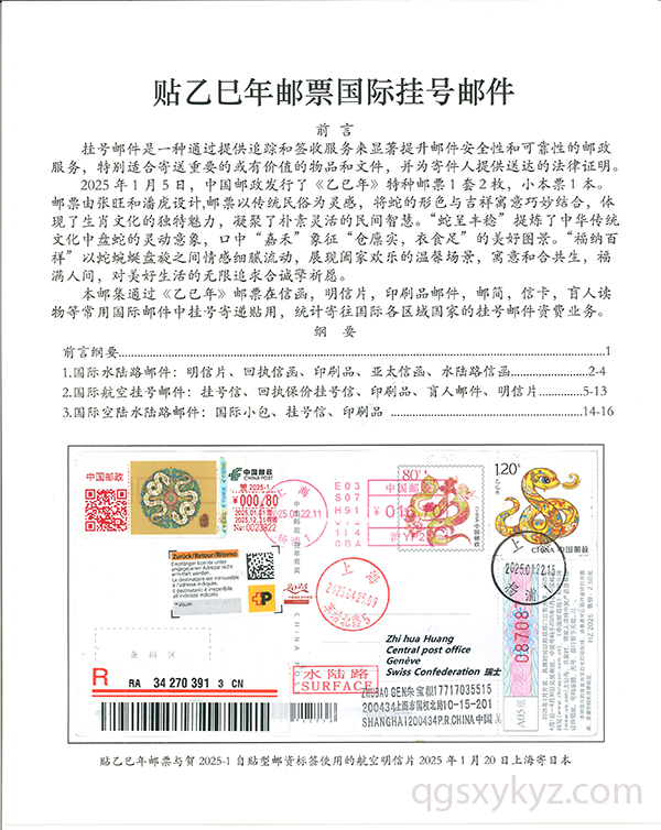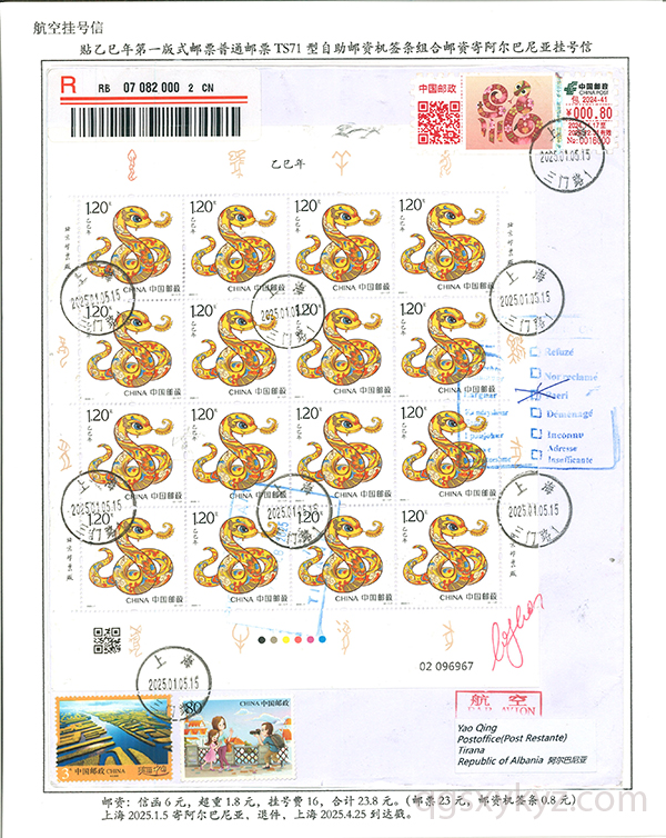 贴乙巳年邮票国际挂号邮件