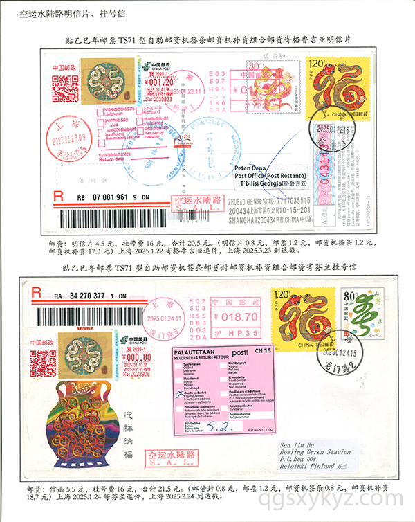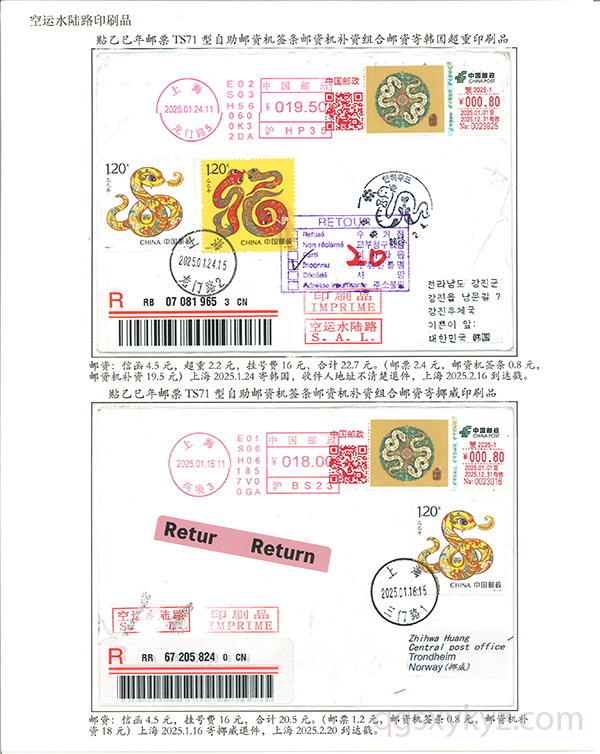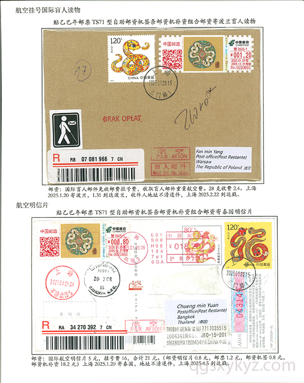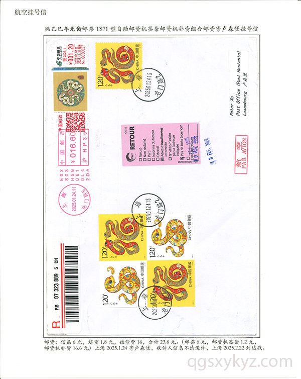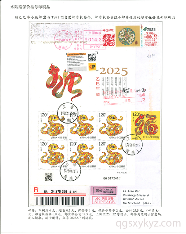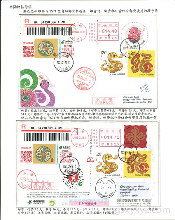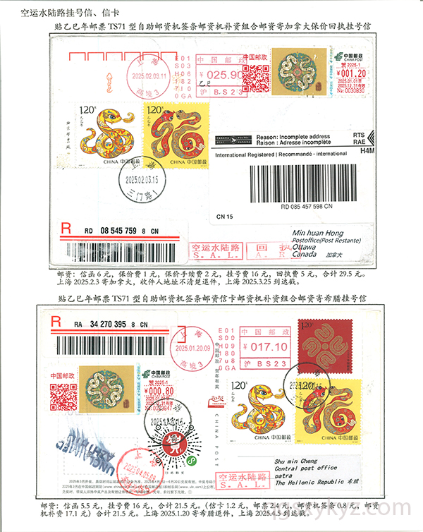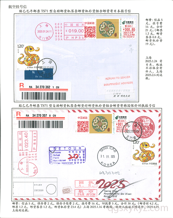 贴乙巳年邮票国际挂号邮件